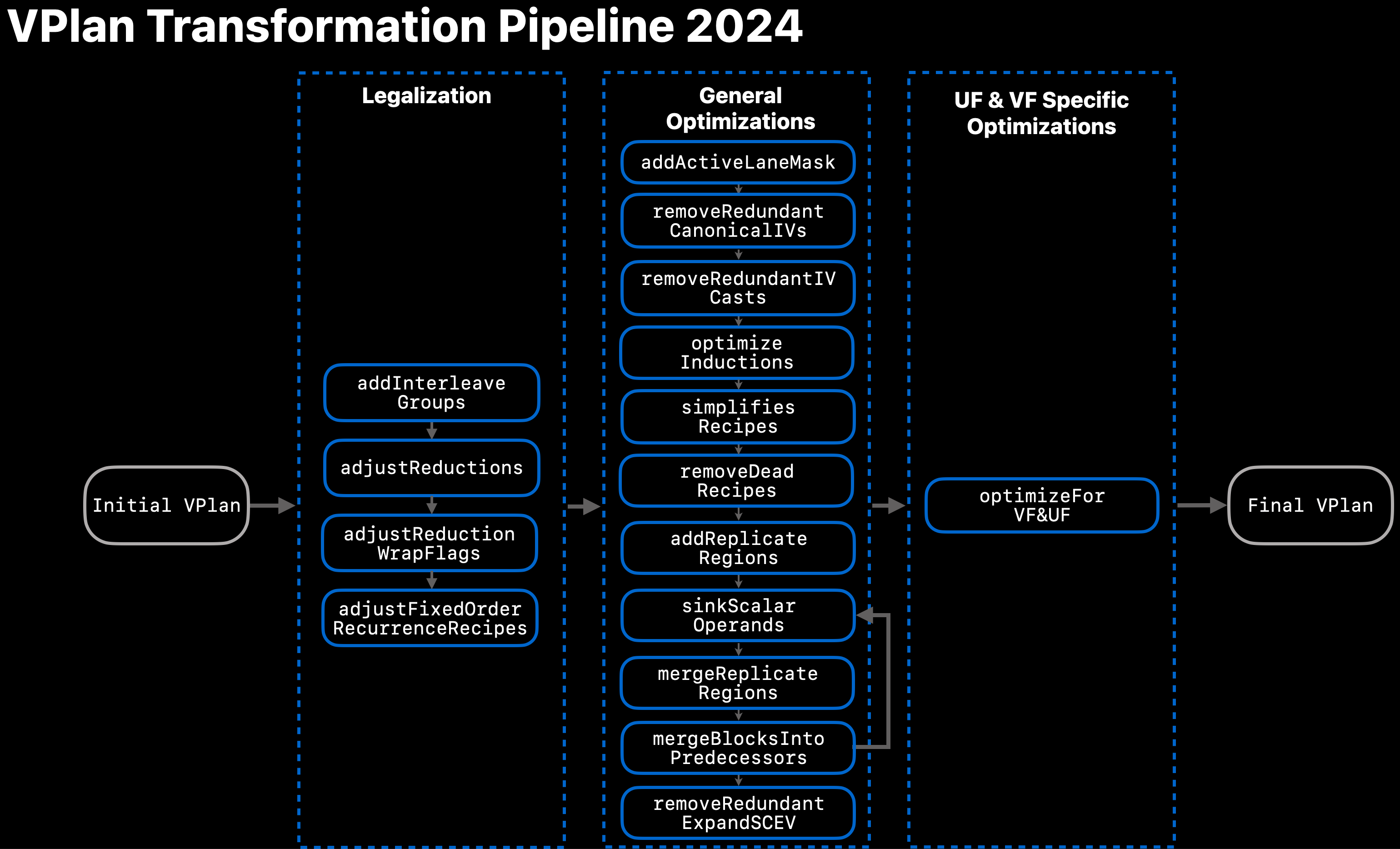 Transforming the Loop Vectorizer to use VPlan follows a staged approach. First, VPlan was only used to record the final vectorization decisions, and to execute them: the Hierarchical CFG models the planned control-flow, and Recipes capture decisions taken inside basic-blocks. Currently, VPlan is used also as the basis for taking these decisions, effectively turning them into a series of VPlan-to-VPlan algorithms. Finally, VPlan will support the planning process itself including cost-based analyses for making these decisions, to fully support compositional and iterative decision making.