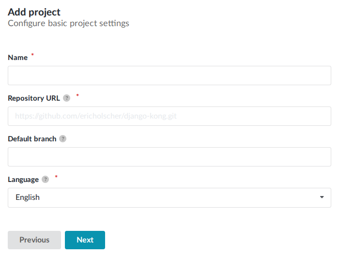 git@..., for examplegit@github.com:readthedocs/readthedocs.org.git.In the Default branch field, provide the name of the default remote branch. This is usually