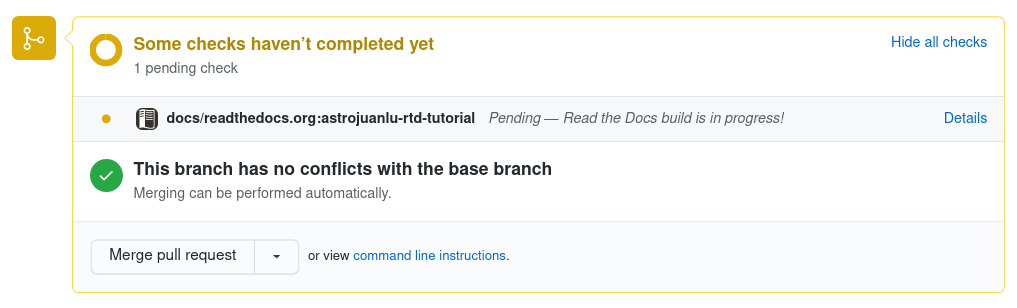 After opening the pull request, a Read the Docs check will appear indicating that it is building the documentation for that pull request. If you click the Details link while your project is building the build log will be opened. After building this link opens the documentation directly.