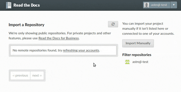 rtd-tutorialproject. If the list of repositories is empty, click the 🔄 button.