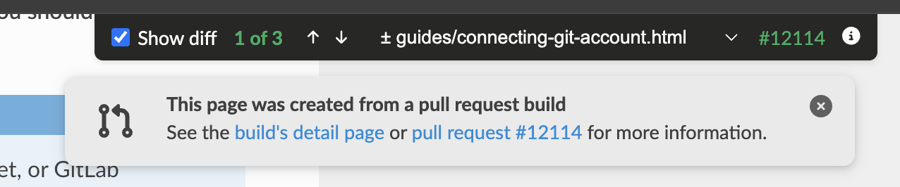Get a list of documentation files that changed between the pull request and the latest version of the documentation, and see their differences highlighted visually on the documentation pages.
